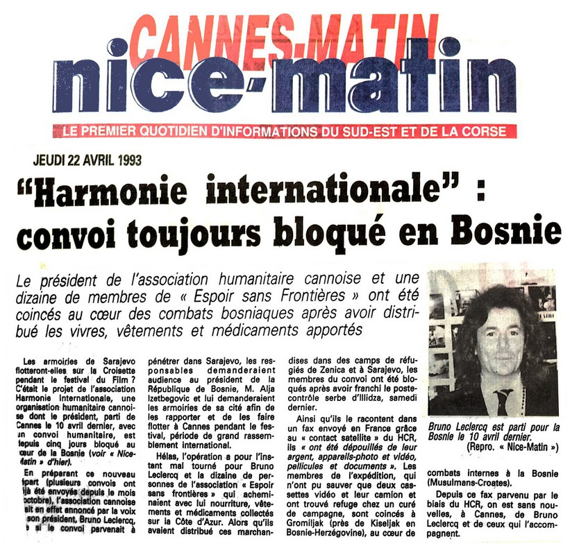 Le Cannois Bruno Leclercq orga­nise en 1993 un convoi huma­ni­taire à des­ti­na­tion des popu­la­tions sinis­trées de Sarajevo.